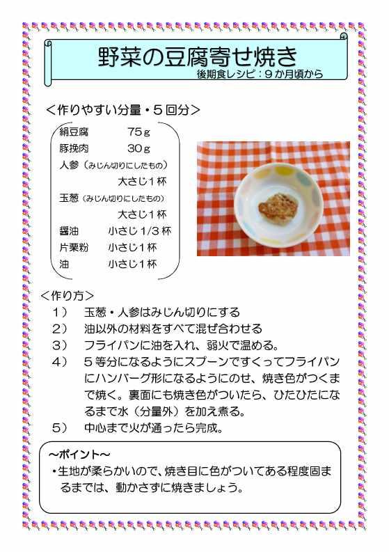 今回は、離乳食(生後9から11カ月・離乳食後期(カミカミ期)~)「野菜の豆腐寄せ焼き」です。